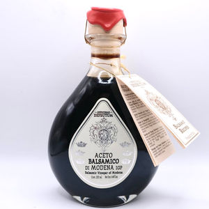 Made of wine vinegar + cooked grape must, aged for minimum 60 days in wood barrels. Acidity 6% - Density 1.13. No coloring Caramel added.